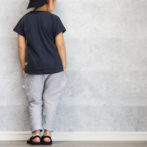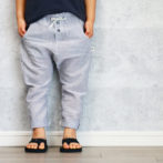 涼しげなライトグレーのピンストライプサルエルパンツ。