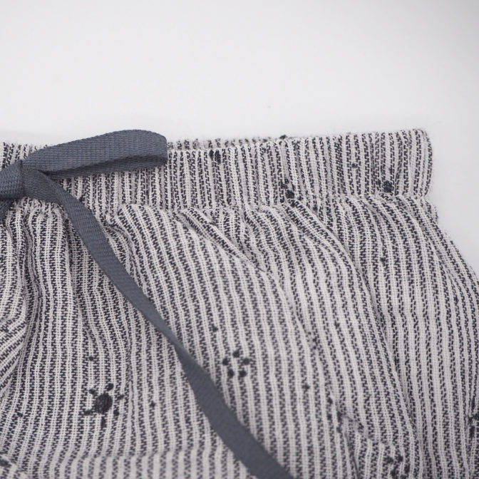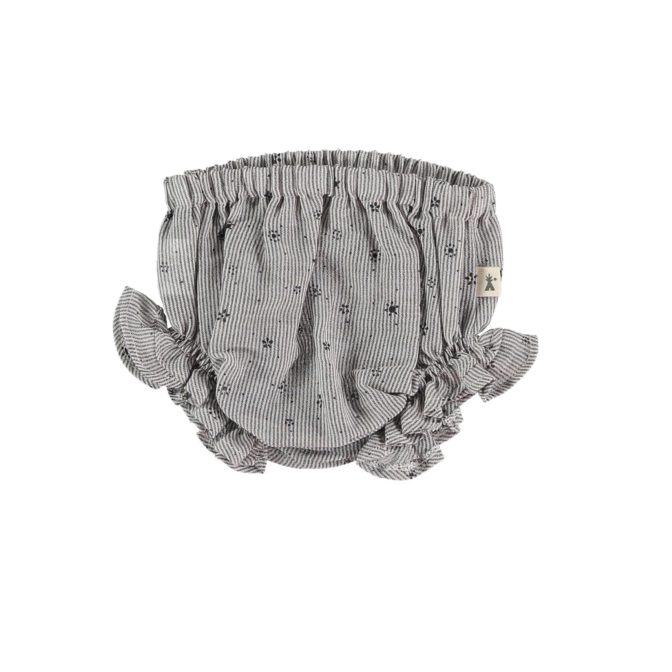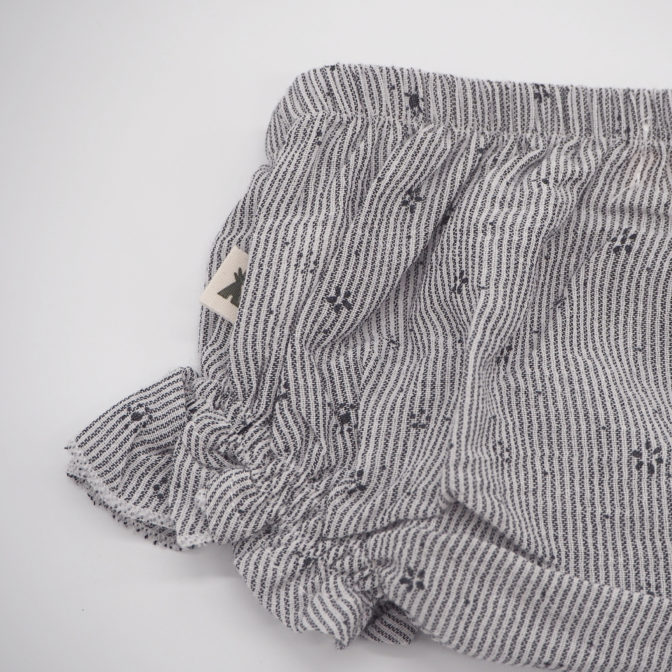 上品なライトグレーのピンストライプに小花のプリントを散りばめ、フリルをあしらったガーリーなベビーブルマ と同じデザインのワンピースもあるので姉妹リンクコーデも叶います。
