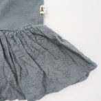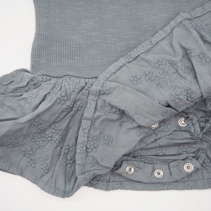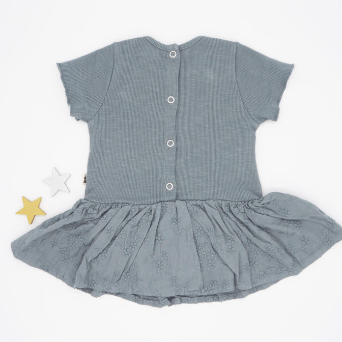 柔らかなオーガニックコットン100%リブTシャツと繊細な小花の刺繍を散りばめたスカートをドッキングしたベビーロンパース。