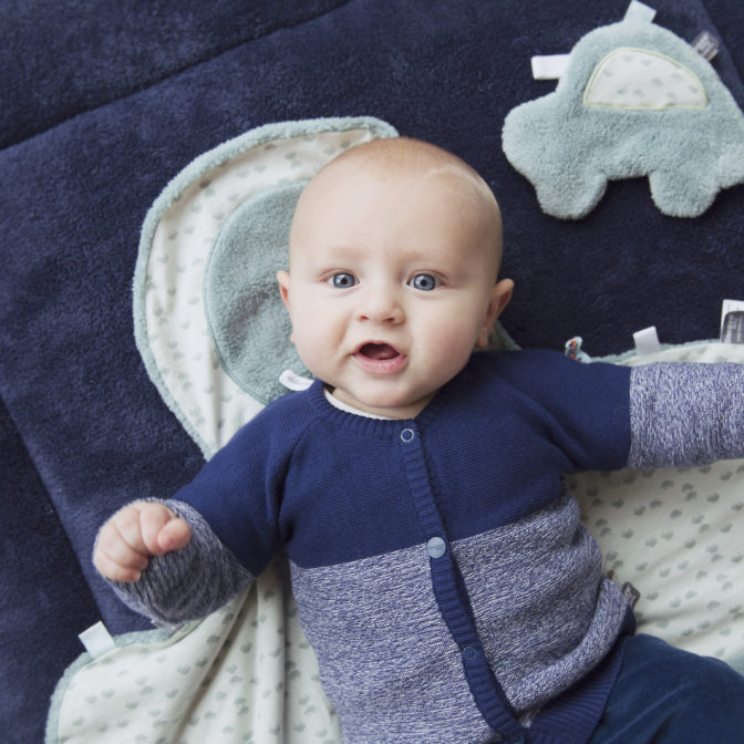 柔らかい布地やタグを感じたり、いじったり、親指を吸ったり、なでたりすることで赤ちゃんは自分自身の快適ゾーンを作り出します。